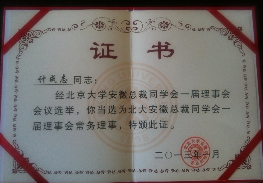 安徽環(huán)瑞總經(jīng)理計成志先生予2012年順利取得北京大學(xué)EMBA高級管理碩士學(xué)位,在2013年4月參加了一屆一次的安徽總裁同學(xué)會常務(wù)理事會。