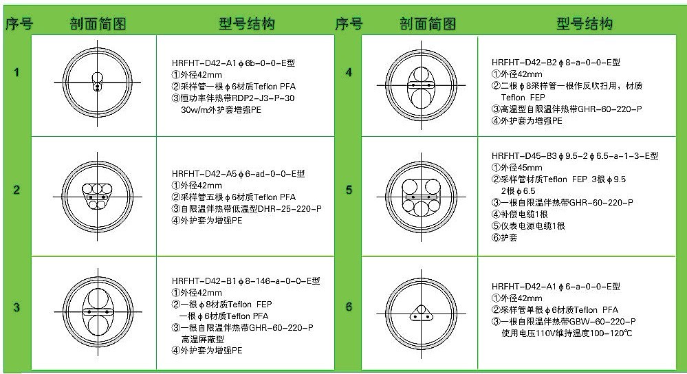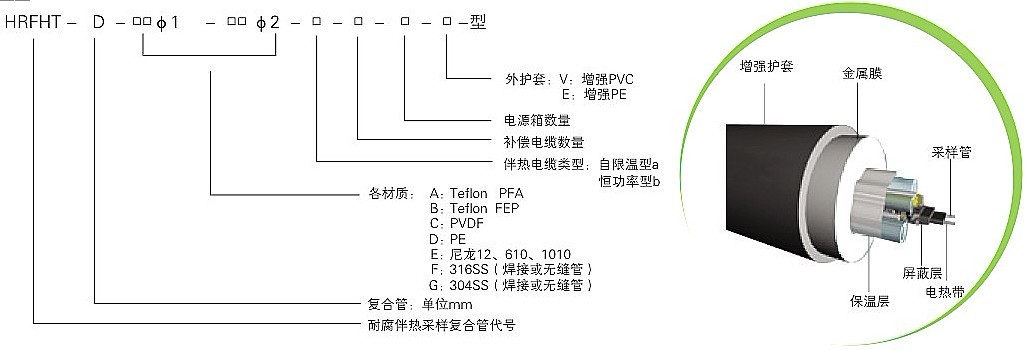 耐腐采樣伴熱復合管是環保監測系統中的重要部件,它是由一組耐腐高性能樹脂導管輔以自限溫伴熱帶以及補償線纜組成內芯,外加保溫層,最后敷以阻燃聚乙烯(PE)保護外套復合而成。自限溫伴熱帶的自動限溫功能,可以保證采樣管內維持一定的溫度,從而盡可能保證采集樣品與初始值保持一致,最終確保環保監測系統連續、正確地采集樣氣。根據采集樣氣的成份、溫度等實際情況,耐腐伴熱采樣復合管中采樣導管可以選用不同的材質,如PFA(四氟乙烯與全氟烷基醚共聚物)、FEP(四氟乙烯和六氟丙烯共聚物)、PVDF(聚偏二氟乙烯)、PE(阻燃聚乙烯)、尼龍610等等, 伴熱帶可以選用中、低、高溫度伴熱帶,另外還可以根據用戶要求添加補償導線、電源線等 。