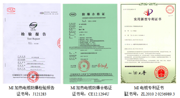 安徽環(huán)瑞MI發(fā)熱電纜獲得了國家專利證書及石油化工協(xié)會頒發(fā)的防爆合格證.