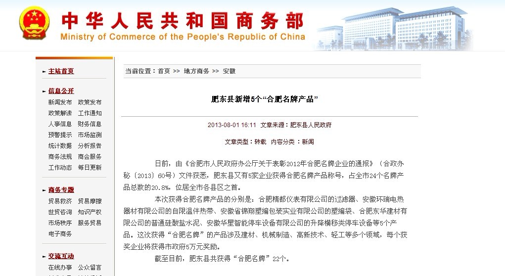 熱烈祝賀環(huán)瑞憑借自限溫電伴熱榮獲合肥名牌產(chǎn)品榮譽(yù)稱號(hào),以下為中華人民共和國(guó)商務(wù)部轉(zhuǎn)載新聞,內(nèi)容如下: