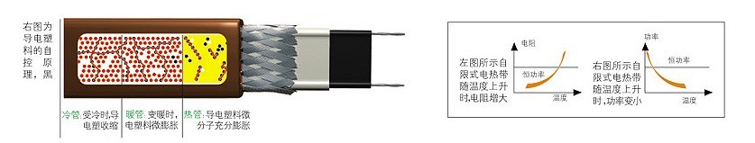 當(dāng)溫度升高時(shí),導(dǎo)電塑料產(chǎn)生微分子的膨脹,碳粒漸漸分開(kāi),引起電路中斷,電阻上升,伴熱線會(huì)自動(dòng)減少功率輸出。