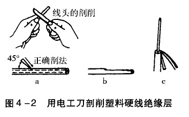 (1)根據(jù)所需的長度用電工刀以45°角斜切入塑料絕緣層,如圖4一2a所示。