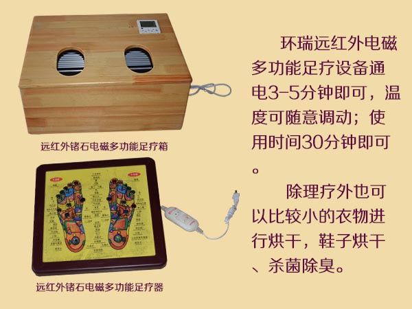 環(huán)瑞遠(yuǎn)紅外鍺石電磁多功能足療器和遠(yuǎn)紅外鍺石電磁多功能足療箱突破了以往足療器采用電動(dòng)脈沖等原理,讓人們足底有震動(dòng)感就能理療的假象。環(huán)瑞暖腳設(shè)備通電后產(chǎn)生17um的遠(yuǎn)紅外光波穿過人體真皮組織對(duì)足部各個(gè)穴位進(jìn)行效的輻射,促進(jìn)人體的新陳代謝氣血運(yùn)行、調(diào)節(jié)內(nèi)臟功能、舒通全身經(jīng)絡(luò),從而達(dá)到祛病驅(qū)邪、益氣化瘀、滋補(bǔ)元?dú)獾哪康慕?jīng)達(dá)以按摩治療的效果。